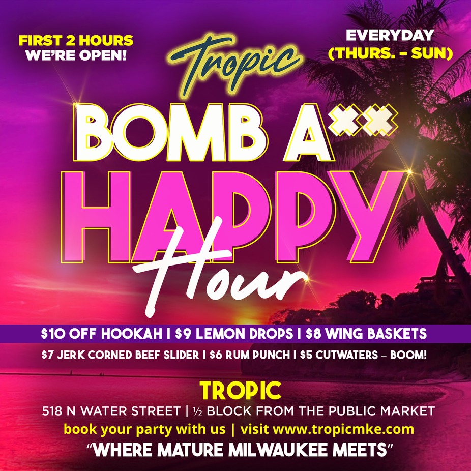 Our Bomb A** Happy Hour is offered EVERYDAY โผ๏ธ Letโs count down these specials โฆ $10 Off Hookah ๐จ $9 Lemon Drops ๐ $8 Wing Baskets ๐ $7 Jerk Corned Beef Slider ๐ถ๏ธ $6 Rum Punch ๐น $5 Cut Waters ๐ณ BOOM ๐ฃ๐ฅ EVERYDAY, yes even Saturday & Sunday! You wonโt find better deals than this. Tag your friends and tell them to meet you at Tropic on Water for a Bomb A** Happy Hour ๐518 N Water Street ๐ฒ Reservations @ www.tropicmke.com
